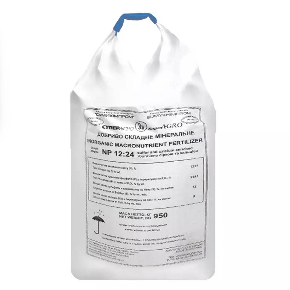 СуперАгро NPS 12:24+12 у народі його ще називають Суперфосфат амонізований NPS 12:24:12 NP(S) 12:24 (12) або Сульфоаммофос NPS 12:24:12 — комплексне добриво, яке містить оптимальну комбінацію поживних речовин для підвищення врожайності та покращення якості сільськогосподарських культур. Це унікальне добриво містить високий вміст азоту (N-12%), фосфору (P-24%) і сірки (S-12%), що забезпечує повне задоволення потреб рослин у цих елементах.