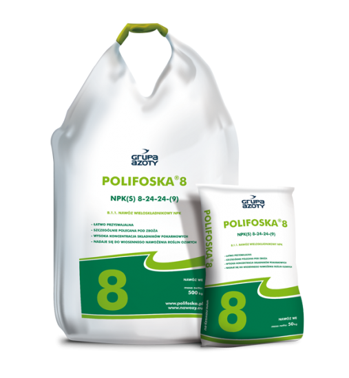 Поліфоска 8 – комплексне багатокомпонентне добриво, особливо рекомендоване для передпосівного застосування, ранньою весною можна використовувати як підгодівлю озимих культур. Це добриво рекомендовано застосовувати під усі культури: озимі та ярі зернові, озимий ріпак, кукурудзу, цукрові буряки, картоплю, на луках та при вирощуванні овочів і садів.